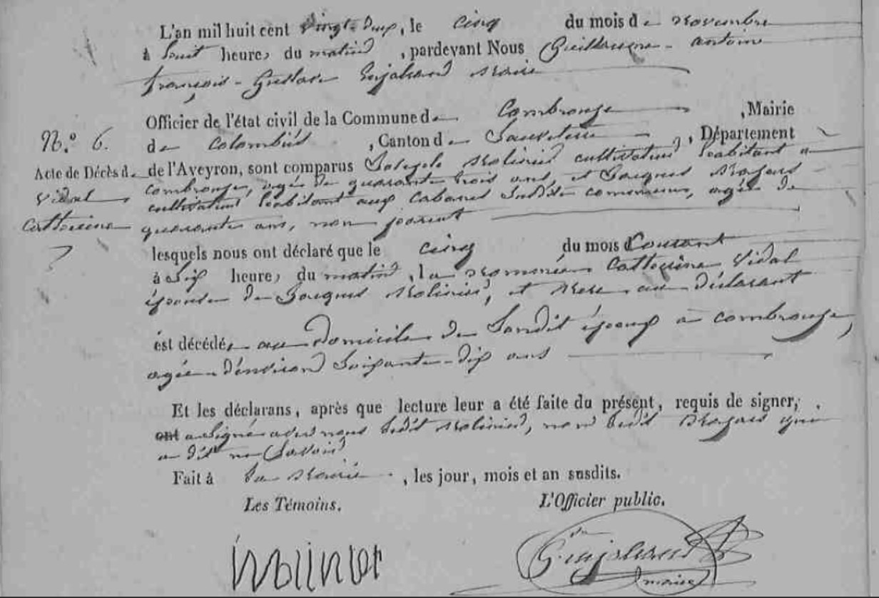 | L'an mil huit cent vingt deux le cinq du mois de novembre à huit heures du matin, pardevant Nous Guillaume Antoine François Gustave .... maire Officier de l'état civil de la Commune de Combrouze, Maire de Colombiès, Canton de Sauveterre, Département de l'Aveyron sont Comparus Joseph .... cultivateur habitant à Combrouze agé de quarante trois ans et Jacques Mazard cultivateur habitant aux Cabanes susdite commune âgé de quarante ans, non parent lesquels nous ont déclaré que le cinq du mois courant à six heures du matin la dénommée Catherine Vidal épouse de Jacques Molinier et ... au déclarant est décédée au domicile du susdit époux à Combrouze âgé d'environ soixante dix ans Et les déclarans, après que lecture leur a été faite du présent, requis de signer ont signer avec nous ledit Molinier, non ... .... qui a dit ne savoir | Décès (plus...) | 5 novembre 1822 à l'âge de 71 ans | Colombiès, Aveyron, FRANCE (, Colombiès, 12068, Aveyron, Occitanie, France) |