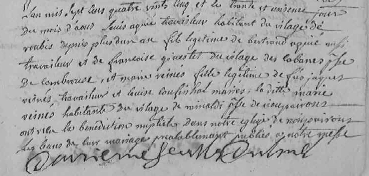 Ayant consulté votre arbre dans le cadre de mes recherches sur la famille de mon épouse Mireille Molinier, je me permets de vous signaler, après vérification auprès des AD en ligne, que le mariage de Louis Acquier et de Marie Reynes, n'a pas eu lieu le 31/8/1765 mais le 31/8/1785, la mère de Marie Reynes, Louise Couffinhal étant née le 23/9/1733 (Les Tors - Rieupeyroux), l'année 1765 du mariage de sa fille, est bien trop proche de sa naissance (peut-être vers 1761).