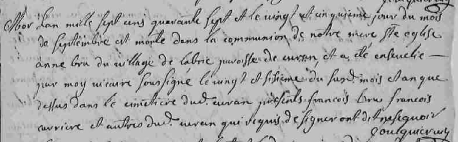 | L'an mille sept cens quarante sept et le vingt et cinquieme jour du mois de septembre est morte dans la communion de notre mere ste église Anne Bru du village de Labric paroisse de Curan et a été ensevelie par moy vicaire soussigné le vingt et sixieme du ... mois et an que dessus dans le cimetière dud Curan présents François Bru François Carrière et autres dud. Curan qui requis de signer ont dit ne savoir Goulguier vic. | Décès (plus...) | 25 septembre 1747 à l'âge de 37 ans | Curan, Aveyron, FRANCE (Labric, Curan, 12307, Aveyron, Occitanie, France) | Témoins Décès | Témoin François Bru Témoin François Carrière