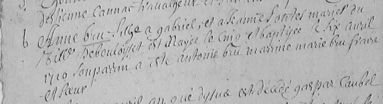 | Prénom | Anne | | Nom de famille | Bru | Anne Bru fille à Gabriel et Jeanne Fontes mariés du ville Debouloysset est ... le cinq et baptisée le six avri 1710 son parrain a été Antoine Bru marraine Marie Bru frère et soeur | Naissance (plus...) | 5 avril 1710 | Salles-Curan, Aveyron, FRANCE (Boulouysset, Salles-Curan, 12253, Aveyron, Occitanie, France) | | Baptême | 6 avril 1710 | Salles-Curan, Aveyron, FRANCE (, Salles-Curan, 12253, Aveyron, Occitanie, France) | Témoins au Bapteme/Naissance | Frère Antoine Bru Soeur Marie Bru