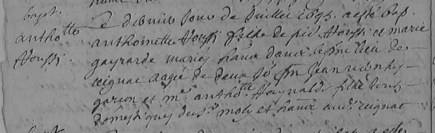 | Prénom | Anthoinette | | Nom de famille | Roussy | Le dernier jour de juillet 1695 a été baptisé Anthoinette Roussi fille de Pierre Roussi et Marie Gayrarde mariés ... le même lieu de Ceignac agée de deux jours parrain Jean .. et marraine anthoinette Raynal fille Rouy (?) ... | Naissance (plus...) | 31 juillet 1695 | Calmont, Aveyron, FRANCE (Ceignac, Calmont d'Olt, 12043, Aveyron, Occitanie, France) | | Baptême | 31 juillet 1695 | Calmont, Aveyron, FRANCE (Ceignac, Calmont d'Olt, 12043, Aveyron, Occitanie, France) | Antoinette Roussi femme de Pierre Mouli de la Fraysse agée de soixante ans est décédée le trente novembre et enseveli le jour après, présent Pierre xgis et Pierre Murans qui ne savent signer de ce requis | Décès (plus...) | 30 octobre 1765 à l'âge de 70 ans | Boussac, Aveyron, FRANCE (Le Fraysse, Boussac, 12032, Aveyron, Occitanie, France) | | Sépulture | 31 octobre 1765 | Boussac, Aveyron, FRANCE (, Boussac, 12032, Aveyron, Occitanie, France) |