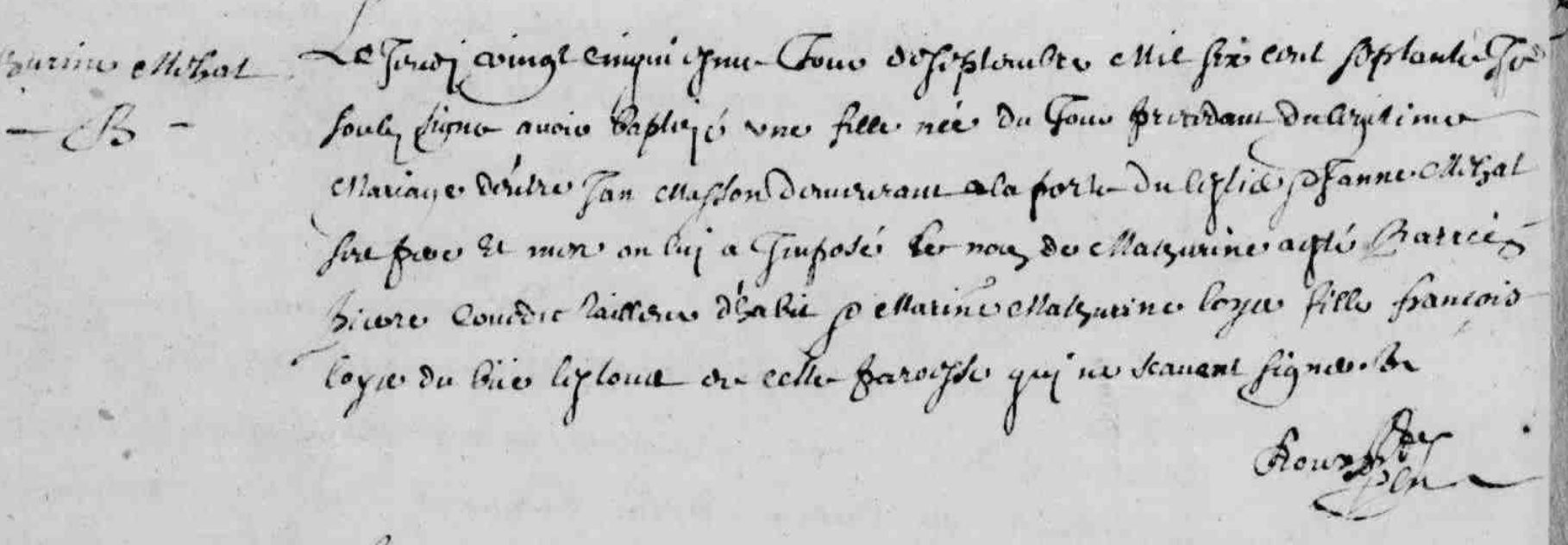 | Prénom | Mathurine | | Nom de famille | Masson | | Naissance | 25 septembre 1670 | Béganne, Morbihan, FRANCE (La porte de Lethier, Béganne, 56011, Morbihan, Bretagne, France) | | Baptême | 25 septembre 1670 | Béganne, Morbihan, FRANCE (, Béganne, 56011, Morbihan, Bretagne, France) | | Décès | 18 janvier 1719 à l'âge de 49 ans | |