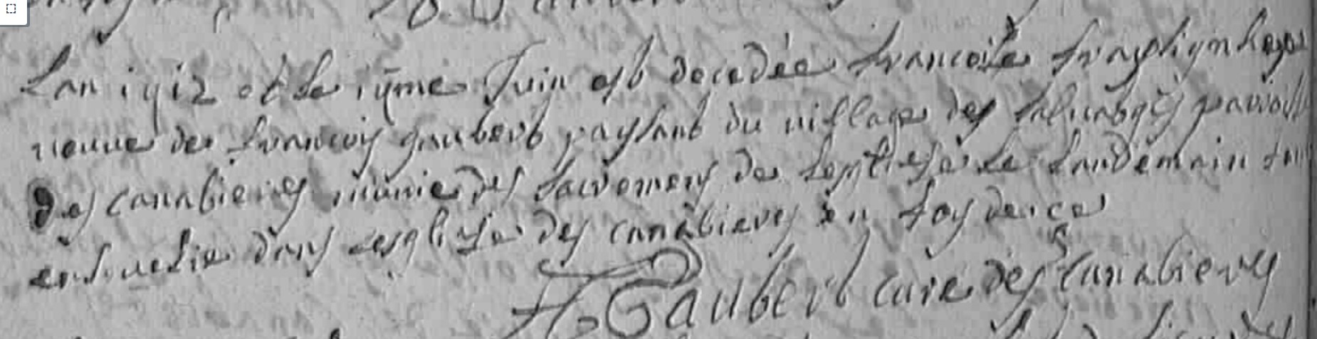 | Prénom | Françoise | | Nom de famille | Frayssinhes | | Naissance | 23 mars 1638 | Salles-Curan, Aveyron, FRANCE (, Salles-Curan, 12253, Aveyron, Occitanie, France) | L'an 1712 et le 17me Juin est decedée Françoise Frayssinges veuve de François Gaubert paysan du village de .... parroisse de Cannbiere munie des sacrements des ....... lendemain ... ensevelie dans l'église de Canabiere en foy de ce | Décès (plus...) | 17 juin 1712 à l'âge de 74 ans | Salles-Curan, Aveyron, FRANCE (Les Canabières, Salles-Curan, 12253, Aveyron, Occitanie, France) | | Sépulture | 18 juin 1712 | Salles-Curan, Aveyron, FRANCE (, Salles-Curan, 12253, Aveyron, Occitanie, France) |