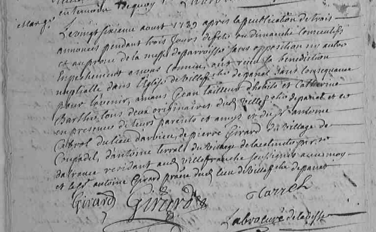 | Union | Amans Jean 454 (23 août 1713 - avant 17 avril 1776) | le vingt sixieme aout 1739 après la publication de trois annonces pendant trois jours de ... ou dimanche consecutigs et au prône de la messe de parroisse sans opposition ny aitre empechement avons ... ... ..la bénédiction nuptialle dans l'église de Villefranche de panat sans conséquence pour l'avenir, Amans Jean Tailleur d'habits et Catherine Barthe tous deux originaires de Villefranche de pana et en présence de leurs parents et anmys et ... d'antoine Cabrol du lieu d'Arvieu, de Pierre Girard du village de Coupadel, d'Antoine Terral du village de lacatin.... paroisse d'Alrance résidant au... villefranche soussignés avec moy et ... Antoine Girard .... dudit lieu de villefranche de Panat | Mariage (plus...) | 26 août 1739 à l'âge de 21 ans | Villefranche-de-Panat, Aveyron, FRANCE (La Besse, Villefranche-de-Panat, 12299, Aveyron, Occitanie, France) | Enfant(s) | Jean Jean