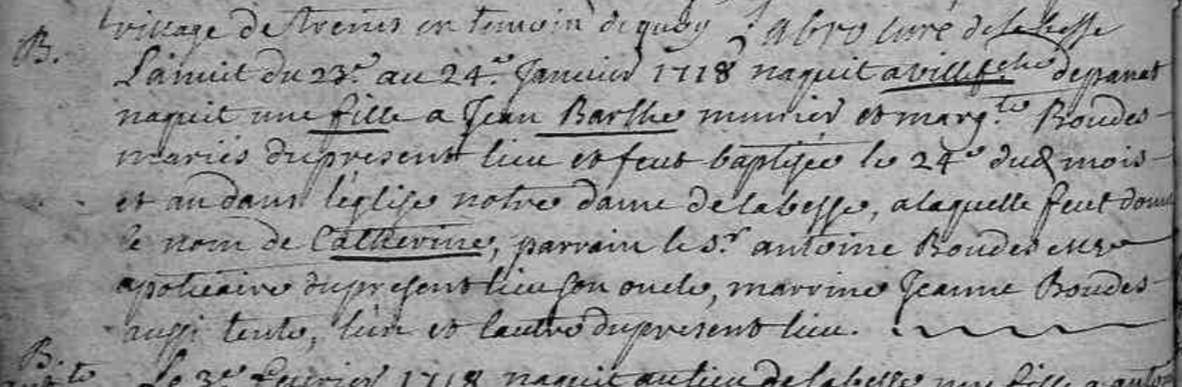 | Prénom | Catherine | | Nom de famille | Barthe | la nuit du 23e au 24e janvier 1718 naquit à Villefche de panat naquit une fille à Jean Barthe m.... et Marguerite Boudes mariés du présent lieu et feut baptisée le 24e dud mois et an dans l'église Notre Dame de la Besse, à laquelle feut donné le nom de Catherine, parrain le sr Antoine Boudes .. apoticaire du présent lieu son oncle, marraine Jeanne Boudes aussi tante, l'un et l'autre du présent lieu | Naissance (plus...) | 23 janvier 1718 | Villefranche-de-Panat, Aveyron, FRANCE (, Villefranche-de-Panat, 12299, Aveyron, Occitanie, France) | | Baptême | 24 janvier 1718 | Villefranche-de-Panat, Aveyron, FRANCE (, Villefranche-de-Panat, 12299, Aveyron, Occitanie, France) | Témoins au Bapteme/Naissance | Oncle Antoine Boudes Tante Jeanne Boudes