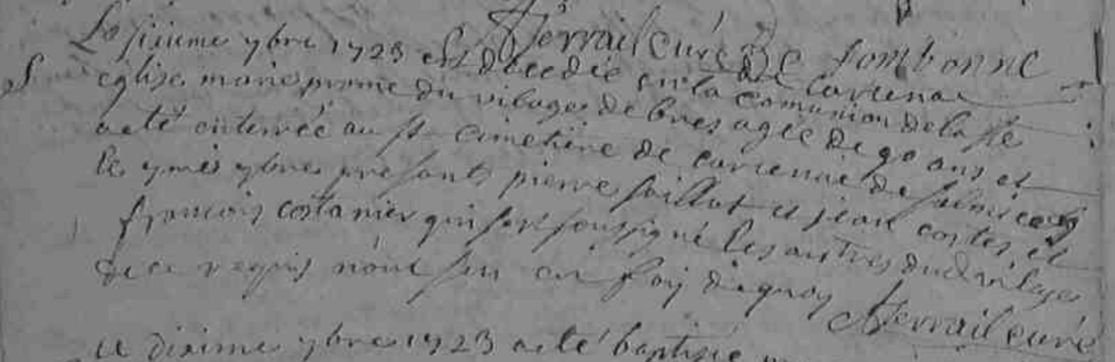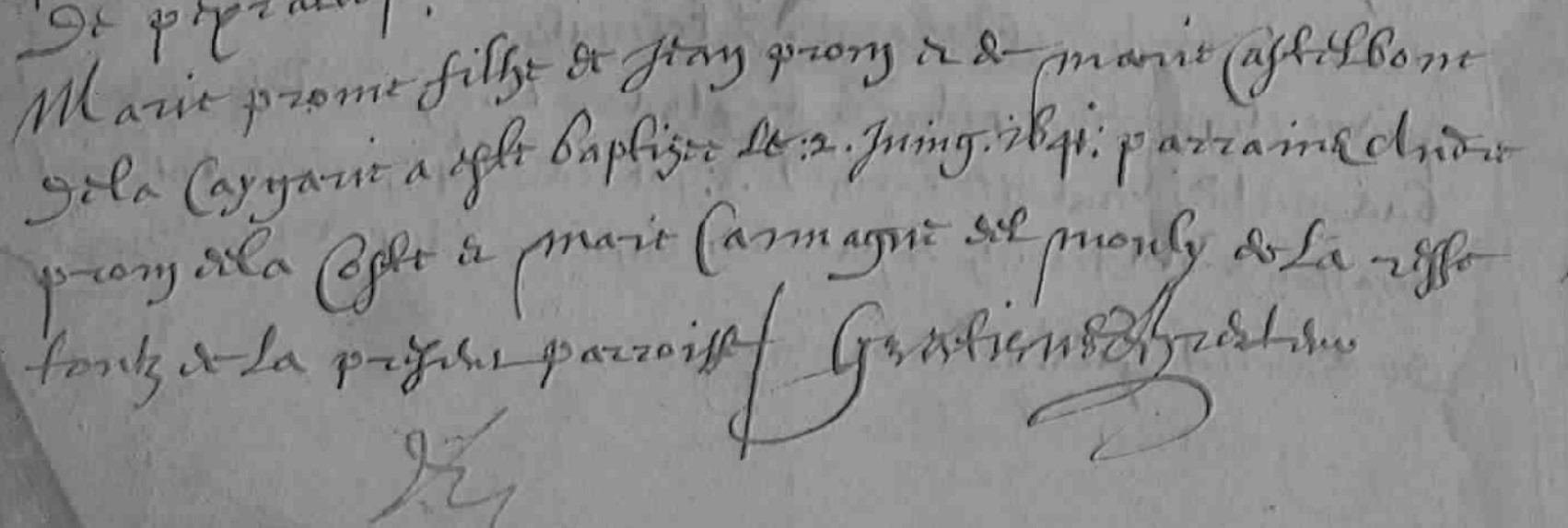 | Prénom | Marie | | Nom de famille | Prom | Marie Prom fille à Jean Prom et à Marie Castelbone de la Caygarie a étée baptisée le 2 juin 1641 Parrain André Prom de la Coste et Marie Cassagne del mouly de la Riffo fontz de la présente paroisse. | Naissance (plus...) | 2 juin 1641 | Alrance, Aveyron, FRANCE (, Alrance, 12006, Aveyron, Occitanie, France) | | Baptême | 2 juin 1641 | Alrance, Aveyron, FRANCE (, Alrance, 12006, Aveyron, Occitanie, France) | le sixieme 7bre 1723 est decedée en la communion de la .... église Marie Prome du village de Bres âgée de 90 ans et a été enterrée au ... cimetiere de Carcenac de .... ... le 7... ... presants Pierre Soillot et Jean Costes et François Castanier qui s'est soussigné, les autres du village de ce requis no... ... en foy de quoy | Décès (plus...) | 6 septembre 1723 à l'âge de 82 ans | Salmiech, Aveyron, FRANCE (Carcenac, Salmiech, 12255, Aveyron, Occitanie, France) | | Sépulture | 6 septembre 1723 | Salmiech, Aveyron, FRANCE (Carcenac, Salmiech, 12255, Aveyron, Occitanie, France) |