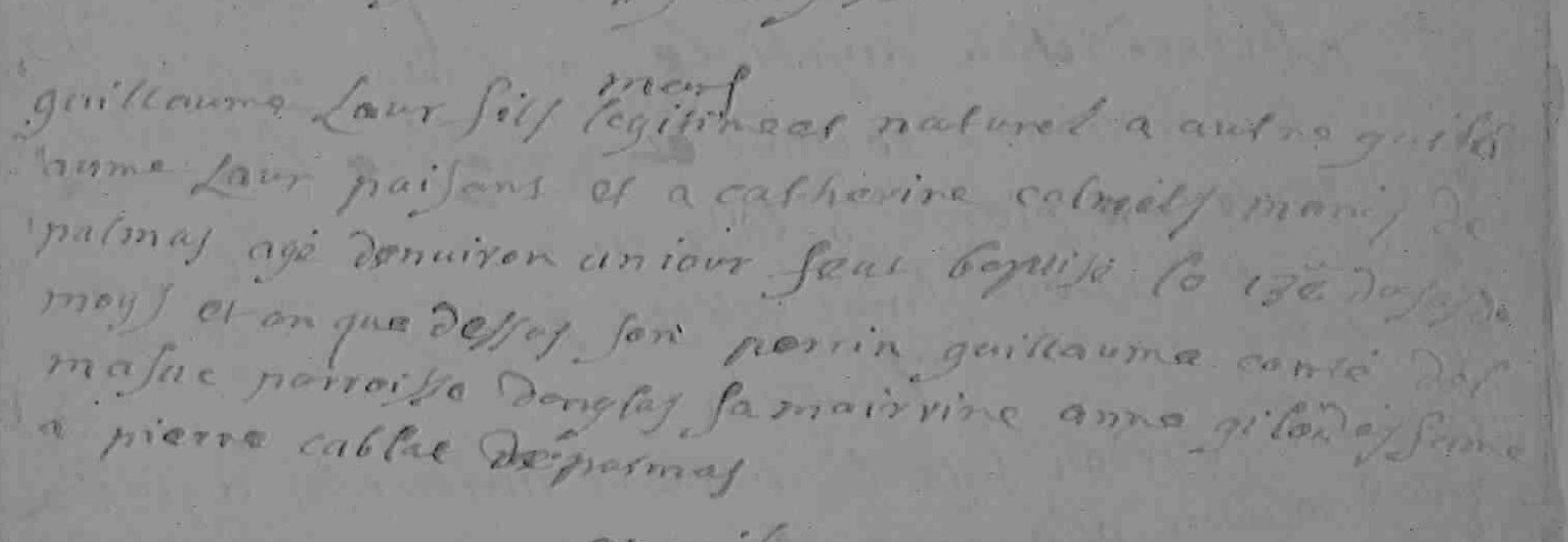 | Prénom | Guillaume | | Nom de famille | Laur | | Naissance | 12 mars 1718 | Palmas, Aveyron, FRANCE (Pont de Palmas, Palmas, 12177, Aveyron, Occitanie, France) | | Baptême | 12 mars 1718 | Palmas, Aveyron, FRANCE (, Palmas, 12177, Aveyron, Occitanie, France) | | Décès | 17 juin 1788 à l'âge de 70 ans | Palmas, Aveyron, FRANCE (Pont de Palmas, Palmas, 12177, Aveyron, Occitanie, France) | | Sépulture | 17 juin 1788 | Palmas, Aveyron, FRANCE (, Palmas, 12177, Aveyron, Occitanie, France) |
